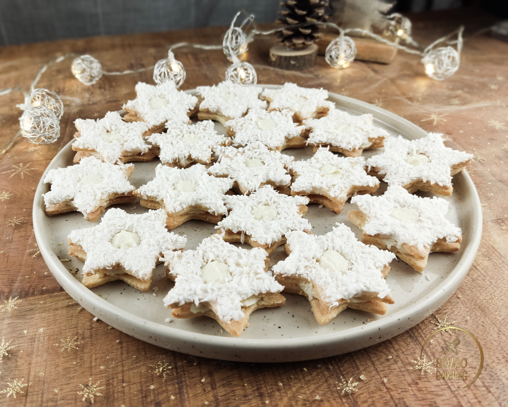 These coconut cookies are made as sandwich cookies, using delicate cut-out bases enriched with almond flour and shredded coconut. The cookies are glued together with a smooth filling made from white chocolate and coconut butter, then finished with a glossy icing-style coating and dipped into shredded coconut. The result is a coconut cookie that’s tender, flavorful, and completely irresistible.